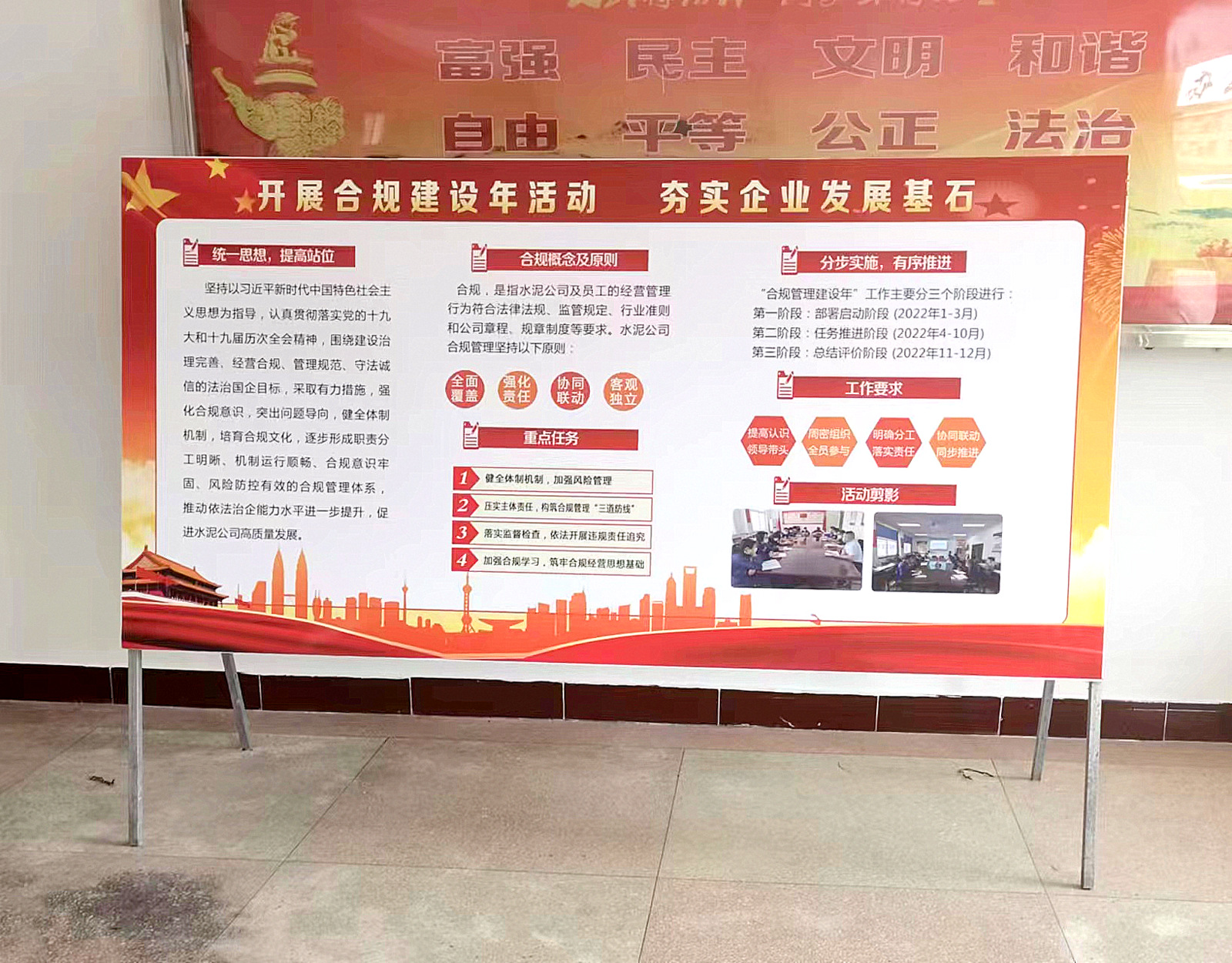 今年以來,相山水泥公司按照集團公司“合規管理建設年”工作要求,積極部署,周密策劃,多措并舉提升依法治企、依規經營水平,以法治化、制度化建設護航公司高質量發展。